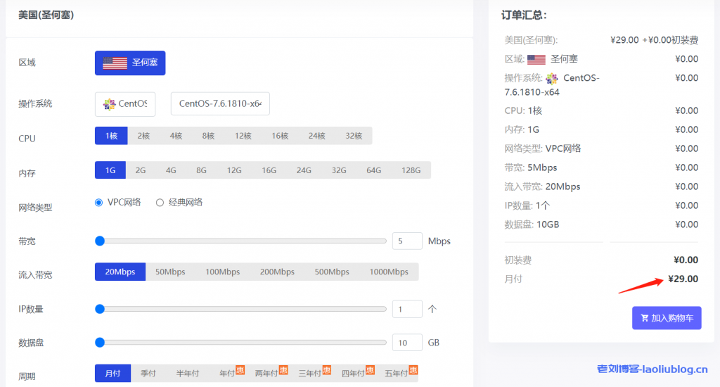 29元美国地区云服务器抵扣券可使用产品入口:官网首页导航栏【云服务器】→【美国地区(电信CN2)】→(进入)。图示如下:圣何塞1核1G内存5Mbps带宽(流入带宽20Mbps)10GB数据盘月付29元,使用抵扣券:apyp5YPy,刚好免费。当然也可以购买其他配置,补差价就行。