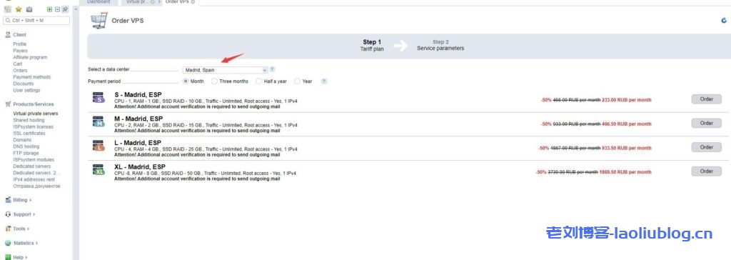 下单时,机房选择Madrid Spain,默认5折优惠,支持月付、季付、半年付和年会,KVM虚拟架构,不限流量,CPU核心数和IP都可以弹性增加。