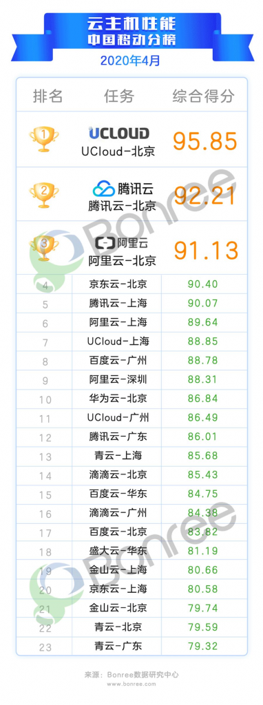老刘今天发现了一个有意思的微信文章《Bonree指数 | 2020年4月云主机性能评测报告》,这里转载来供大家参考,在选购云主机的时候老刘决定有一定帮助。作为UCloud粉的老刘看到评测结果很是欣慰,UCloud云主机的实力很是可以啊,榜单第一!