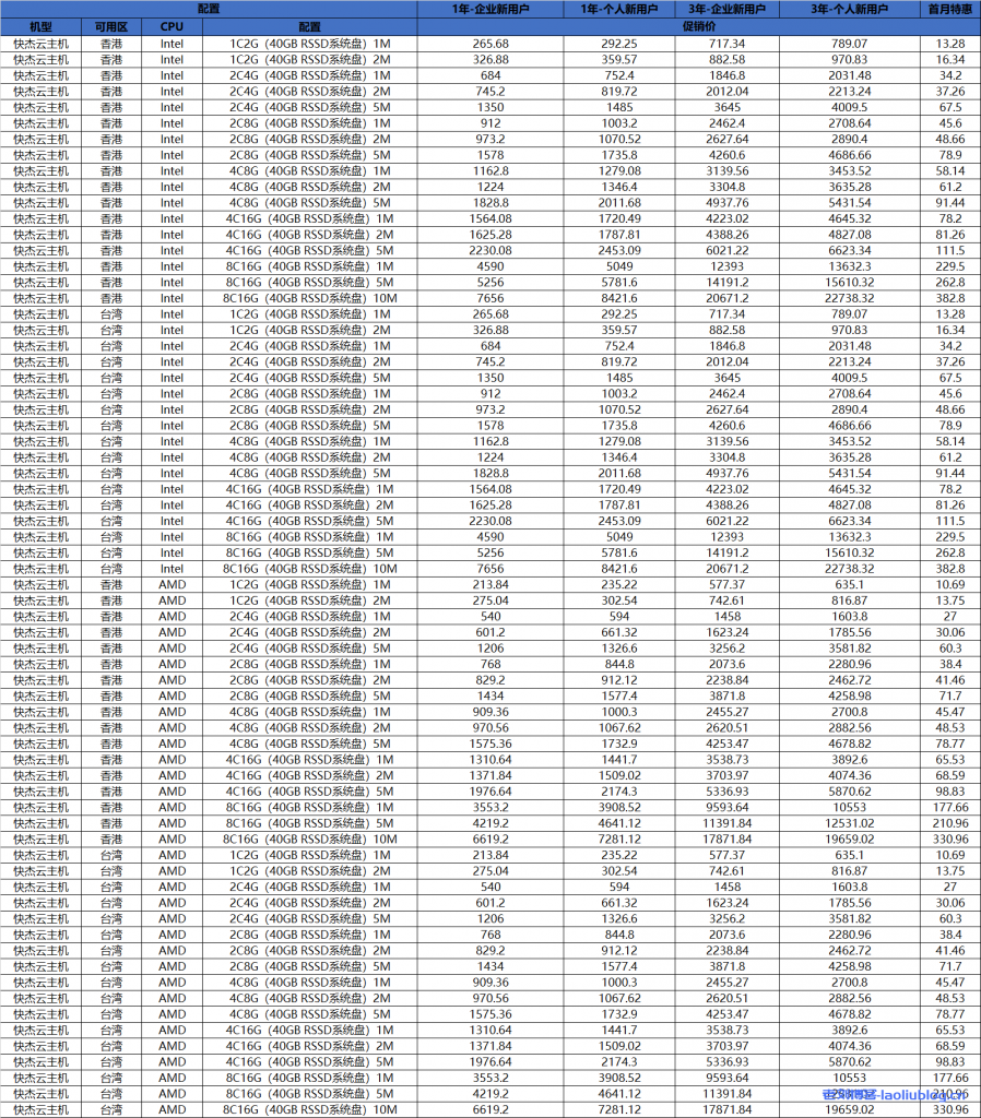 老刘博客这里列出UCloud官方给出的香港台北可用区各规格配置对应的具体价格表: