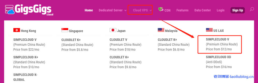 网站首页“ https://www.gigsgigscloud.com/ ”,点击“Cloud VPS”下拉看到“SIMPLECLOUD V”进入,找到SimpleCloud V1进入购买即可。