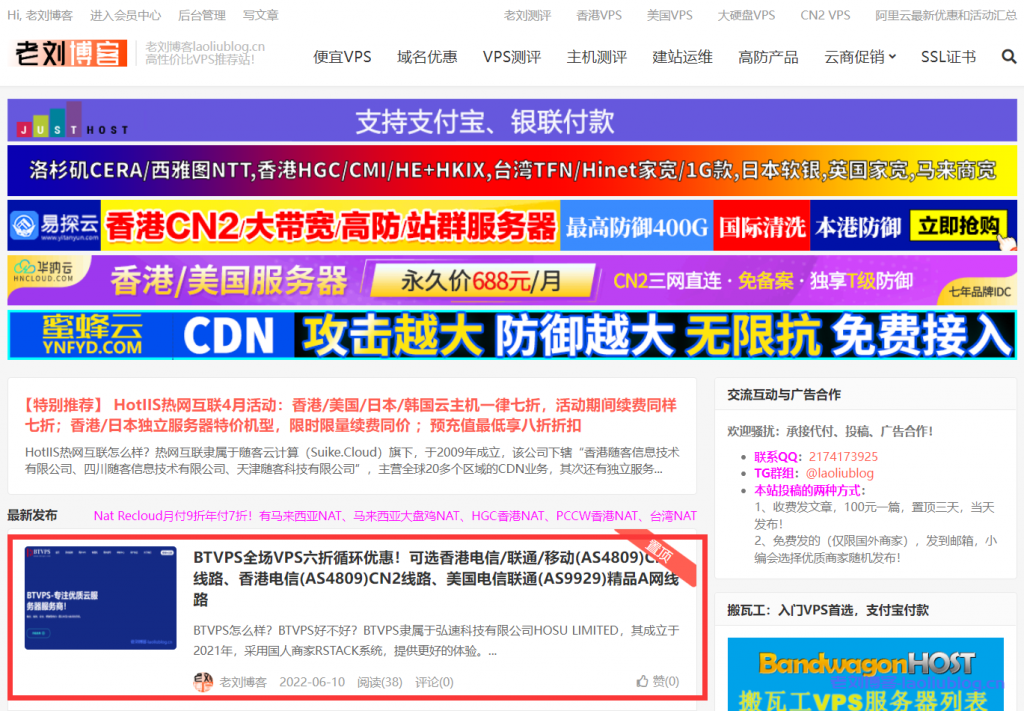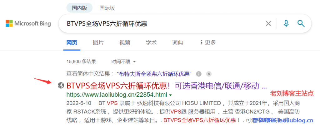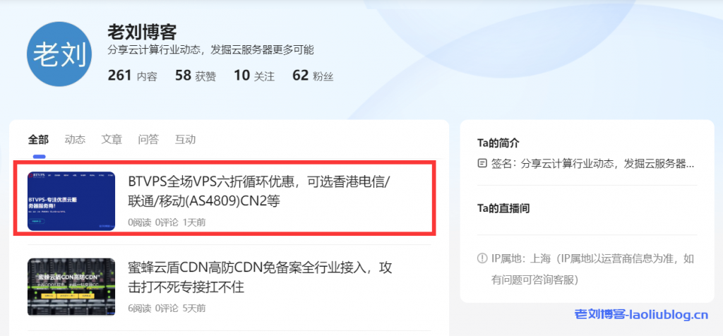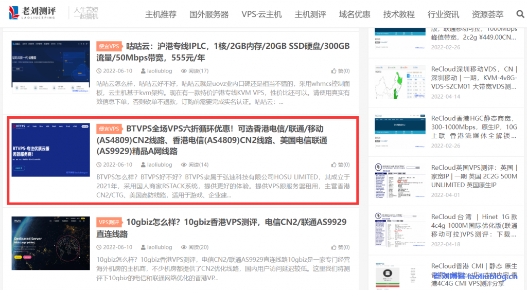老刘博客主站点:BTVPS全场VPS六折循环优惠!可选香港电信/联通/移动(AS4809)CN2线路、香港电信(AS4809)CN2线路、美国电信联通(AS9929)精品A网线路-老刘博客 (laoliublog.dyt.one),图示: